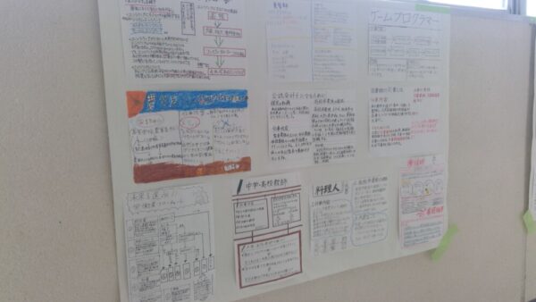 山梨県立上野原高等学校 > 教育活動 > 1年次『産業社会と人間』職業研究 2021年7月7日カテゴリー: 教育活動 1年次『産業社会と人間』職業研究 1年次生は『産業社会と人間』の授業で職業研究を行いました。 パズルワークや調べ学習を通して将来なりたい職業を探しました。 職業研究のまとめとしてポスターを作成し、教室前の廊下に掲示をしています。 わかりやすいレイアウトや文章を考え、素晴らしいポスターが出来上がりました。