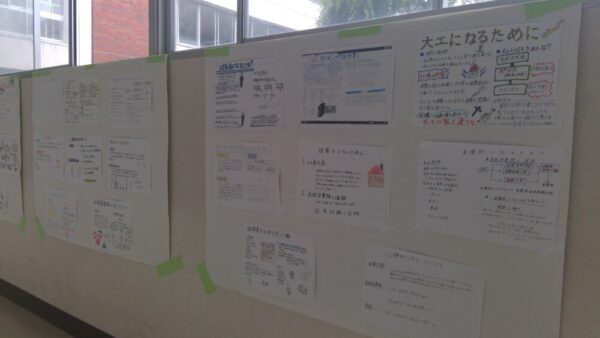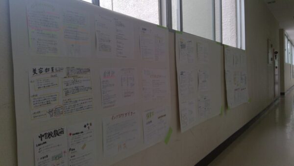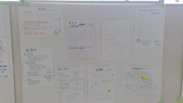 職業研究のまとめとしてポスターを作成し、教室前の廊下に掲示をしています。