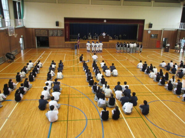 納め式は、陸上部の選手たちが素晴らしい成績を納め生徒の前で報告を行いました。