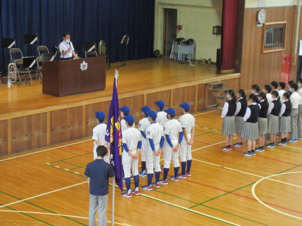 山梨県立上野原高等学校 > 学校行事 > 納め式・壮行会が行われました♪ 2021年7月12日カテゴリー: 学校行事 納め式・壮行会が行われました♪ 納め式は、陸上部の選手たちが素晴らしい成績を納め生徒の前で報告を行いました。 第103回全国高校野球選手権山梨大会・吹奏楽コンクールの壮行会が行われました。 教頭先生から 「緊張を楽しみに変え、練習の成果を発揮してほしい」と激励のお言葉がありました。 野球部主将は「去年の卒業生の分まで頑張るので、応援よろしくお願いします!」と力強い言葉があり、 吹奏楽部部長からは、「いい音、いい演奏をしてきます♪」とあいさつがありました。 野球の初戦は、7月13日16:30~都留興譲館高校と対戦します。 吹奏楽部は、7月18日です。 みんなで上高を応援しましょう! そしてガンバレ上高!!