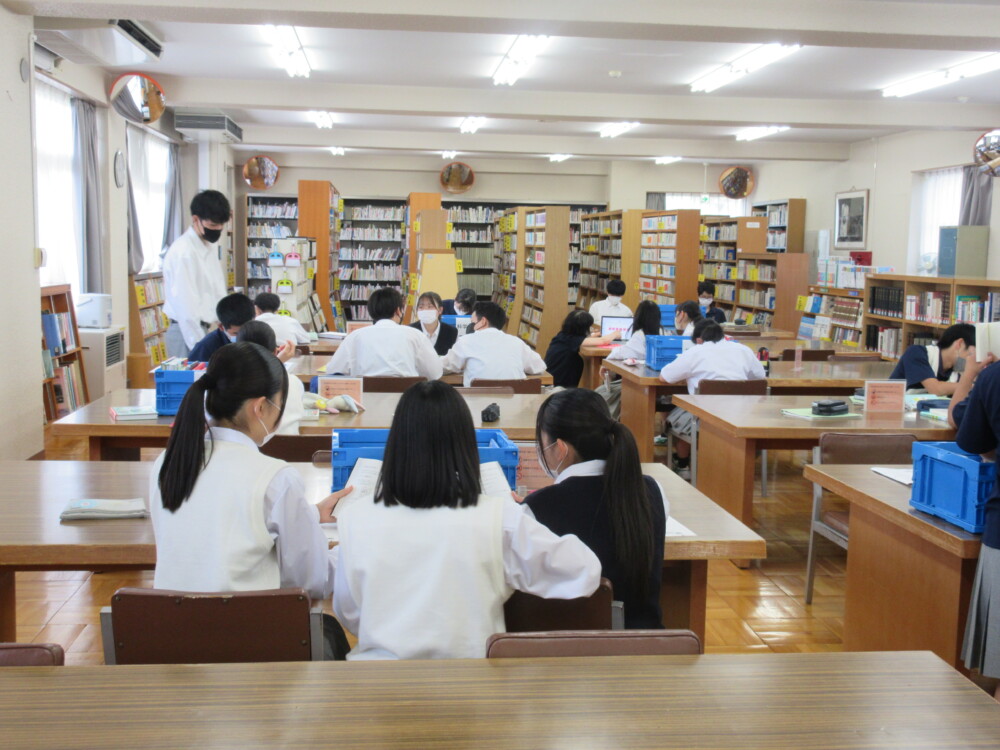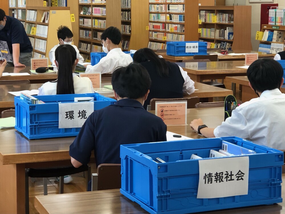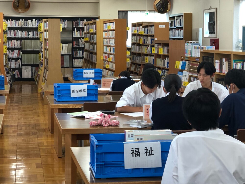 1年次の『産業社会と人間』の授業で図書館を使った調べ学習を行いました。前回「情報社会」「福祉」「環境」「国際理解」「科学技術」「政治経済」の6つのキーワードの中から自分が興味を持つ学問・職業と結び付け、BYODで社会問題について調べました。今回は、インターネットの情報だけではなく書籍にあたることも大切であるということを知るため、図書館でテーマごとのコーナーを用意してもらい、それを使って学習をしました。