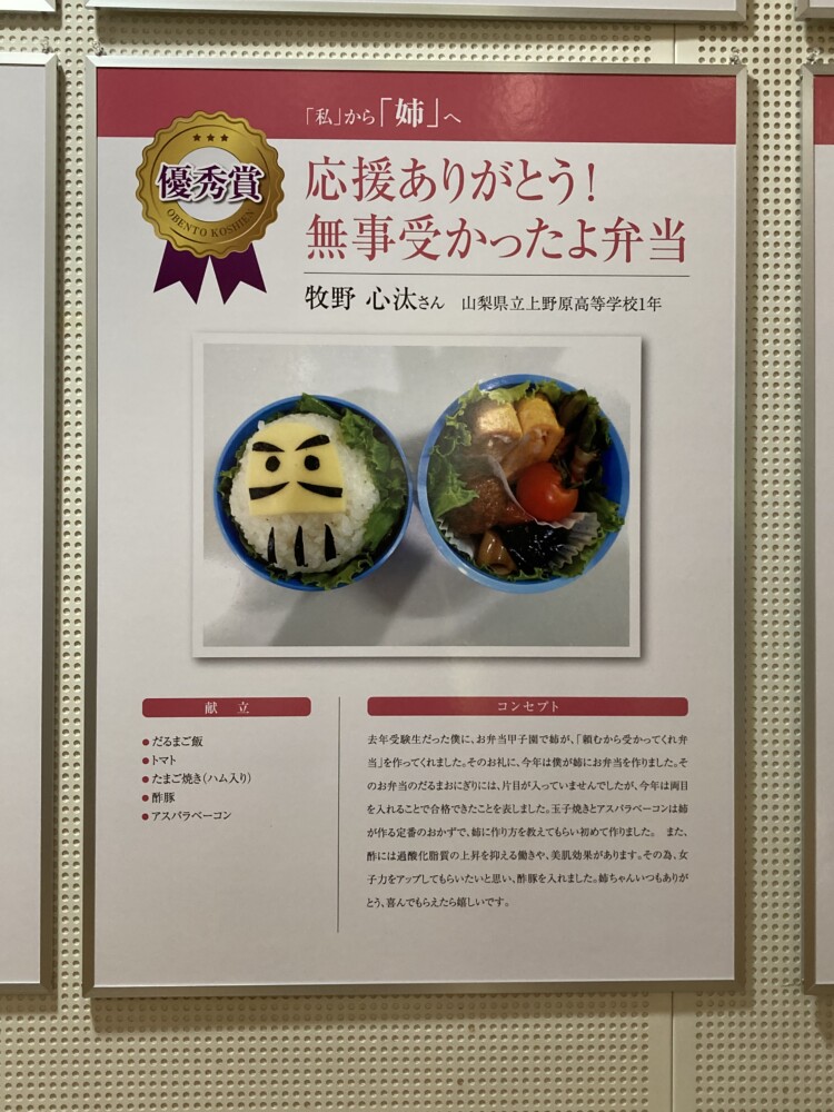 山梨県立上野原高等学校 > 教育活動 > ㊗ 第12回お弁当甲子園 優秀賞受賞! 2023年11月8日カテゴリー: 教育活動 ㊗ 第12回お弁当甲子園 優秀賞受賞! 家庭科の夏休みの課題として、1年次生全員と2年次生の家庭科選択者が第12回お弁当甲子園(主催:鎌倉女子大学・高校生新聞)に取り組み、作品を応募しました。 そして、なんと! 応募総数11,163作品の中から、本校の1年次生、牧野心汰さんが『優秀賞』に選ばれました! おめでとうございます🎉 『優秀賞』は、最優秀賞1名・審査員特別賞2名に次いで全国から4名が選ばれる賞です。 この「お弁当甲子園」は『身近な誰かへの想いをお弁当に込め、それを表現する』というコンセプトとなっています。 昨年度、佳作に入選した2年次生の牧野瑠香さんに続いて、姉弟による2年連続入賞となりました✨ ↑ 11/4(土)表彰式(@鎌倉女子大学 大船キャンパス) ご協力いただきました皆様、課題に一生懸命取り組んでくれた生徒のみなさん、ありがとうございました。