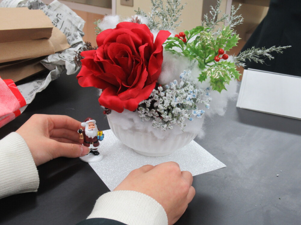 今日はいつもの部活と異なり、生花ではなく造花などを工夫して使いながらクリスマスの飾りを作りました。