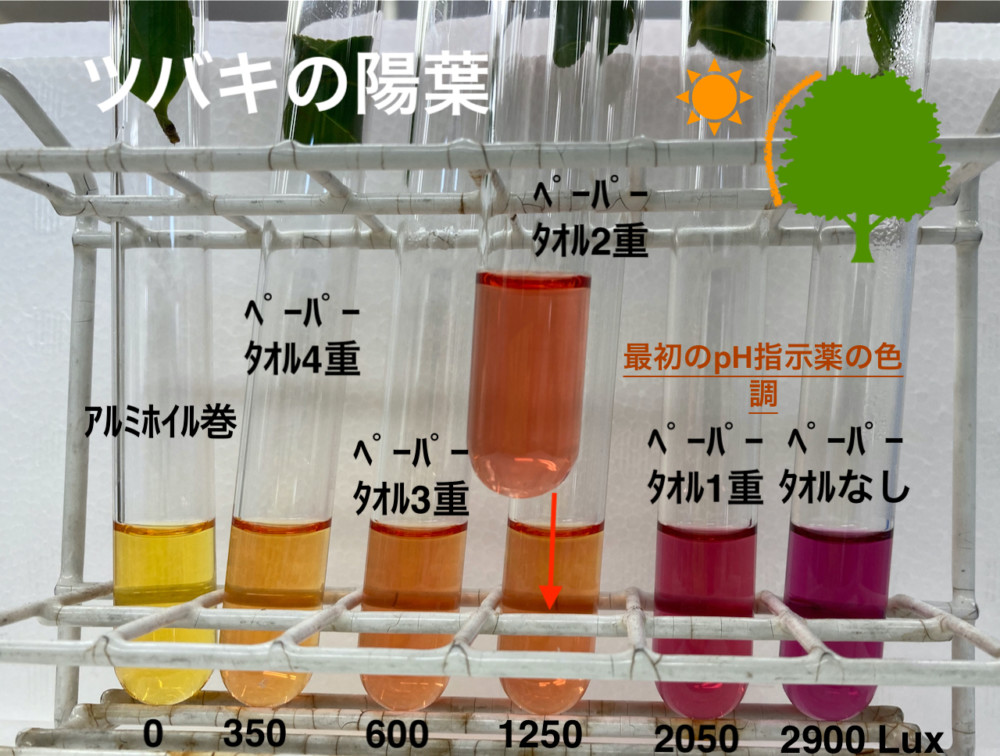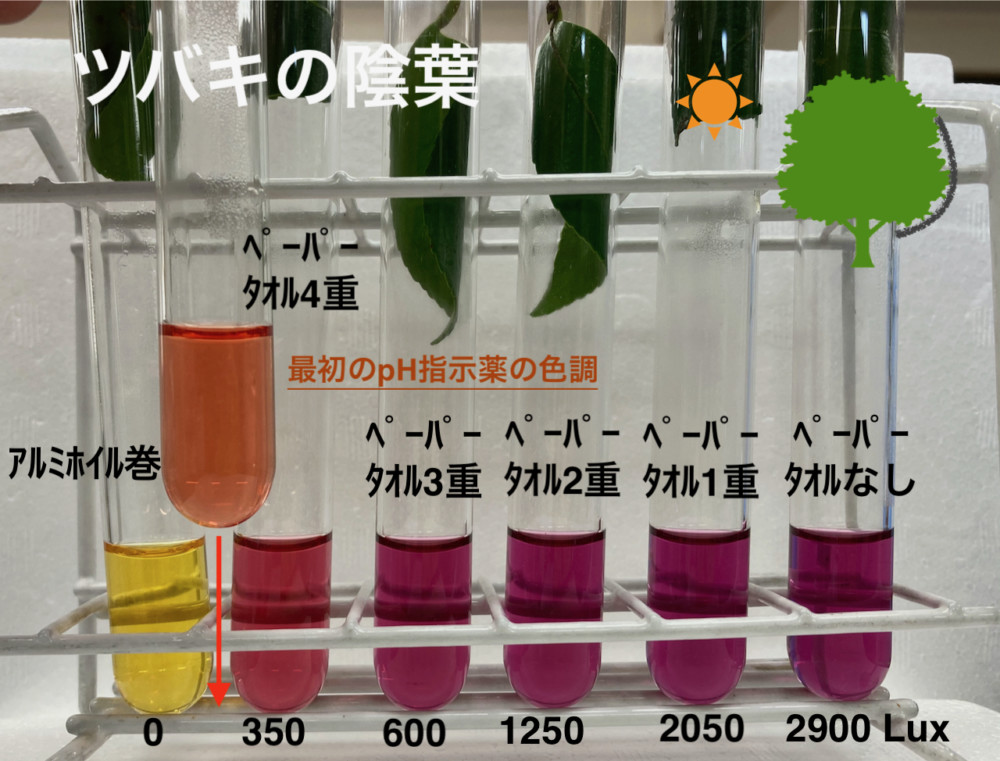 日当たりの良い恵まれた環境にいる「陽葉(ようよう)」と薄暗い環境で成長する「陰葉(いんよう)」の光要求性の違い「光補償点」をpH指示薬を使って測定しました。この指示薬は、光合成と呼吸で出入りするCO2に敏感に反応し、黄色(CO2多い)⇔ オレンジ色 ⇔ 赤色 ⇔ 紫色(CO2少ない)と変化します。
