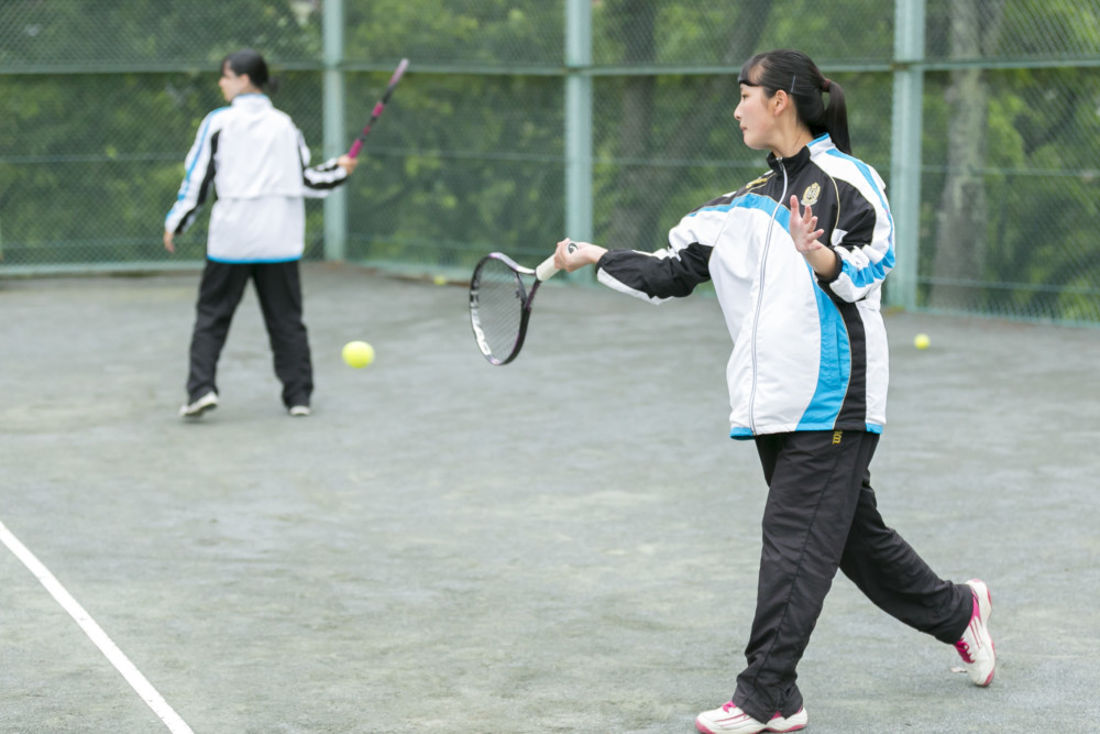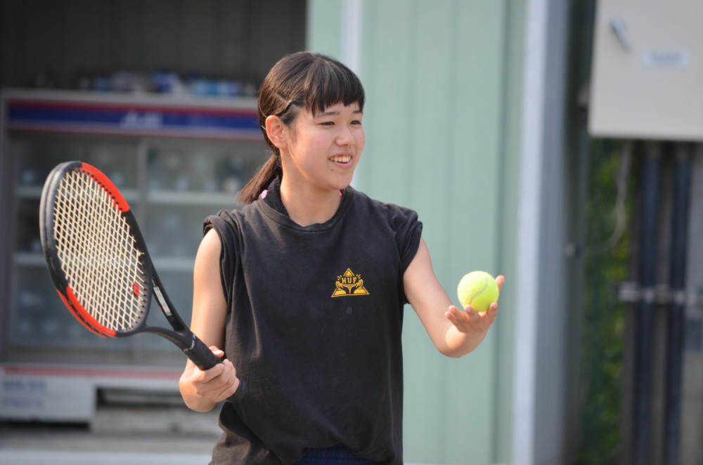 私たち硬式テニス部は、1年生が入学して1年生1人、2年生4人の計5人という少ない人数で活動しています。新型コロナウイルスの影響で、今年も夏の合宿などが中止となってしまいました。今年は3年生がいなくて、先輩方から教わる機会がなく、今まで教わってきたことを基本として1人1人がみんなをフォローし合いながら練習しています。人数が少ない中、できる練習メニューは限られていますが、日々練習をしています。積極的に動くこと、声を出すことなどが少し減ってしまっています。試合では、あまり勝ち進むことができず、全員が悔しい思いをしました。しかし、そこで自分たちの課題点を見つけることができたので、次の大会に向けて、課題点を克服できるようにみんなで練習しています。